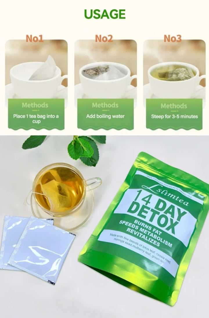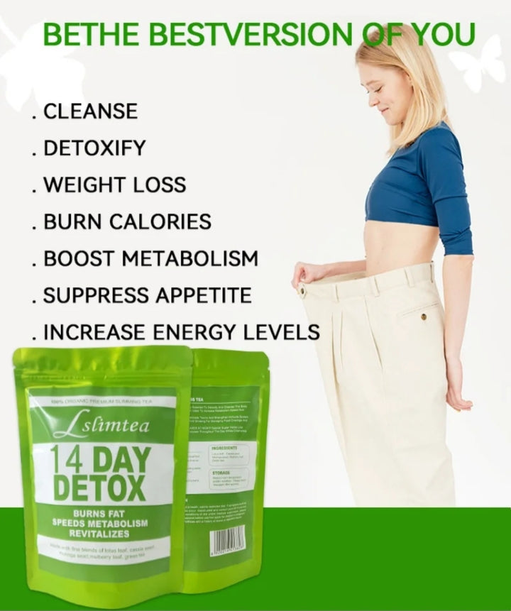 Slimtea 14 DAY DETOX," a premium slimming tea designed to support weight management and overall well-being. Reduce bloating, increase energy levels, and promote better digestion through its natural cleansing.The tea is made with a blend of natural herbs and botanicals, including Lotus leaf, Senna obtusifolia, mulberry leaf, liquorice, hemp seed, Tuckahoe, and Green tea.